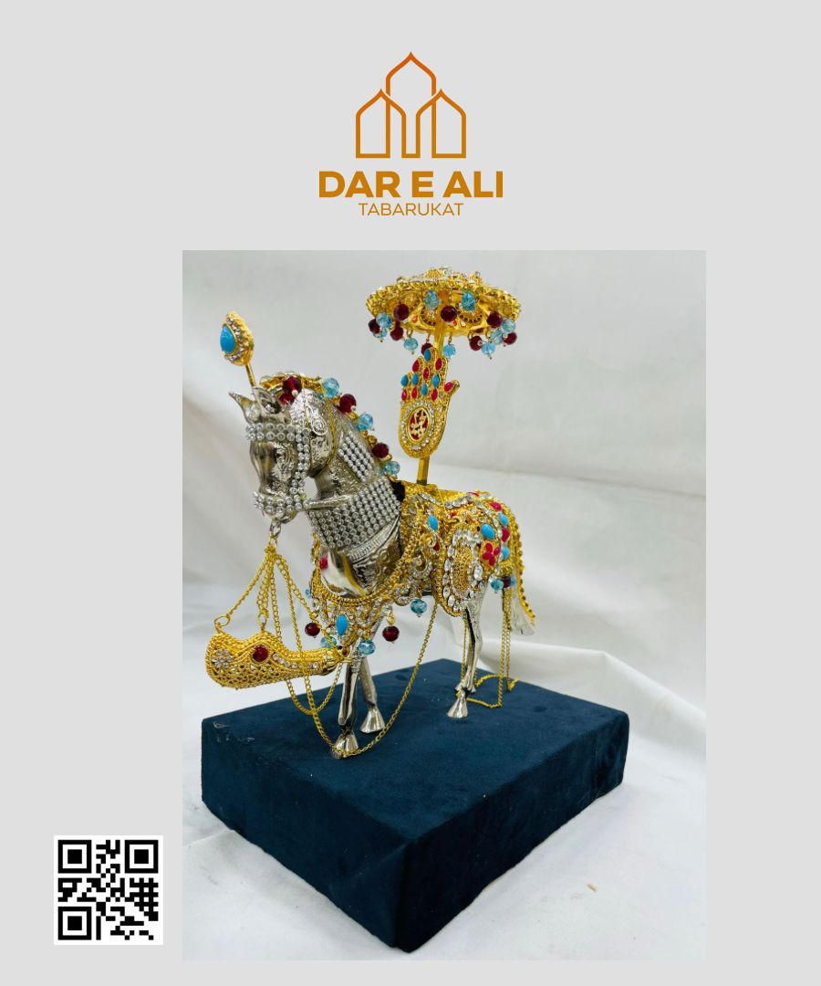 Details: Kashi work Zuljanah made in German Silver with Beautiful Jewellery on top in Multi color stonework to make it enchanting for your Azakhana. The work speak of itself with kashi and multi-color stonework. Mola Abbas as Panja is placed under umbrella with jhomars surrounding it that add its beauty. The Blue Base of the Zuljanah is also escalating its looks.